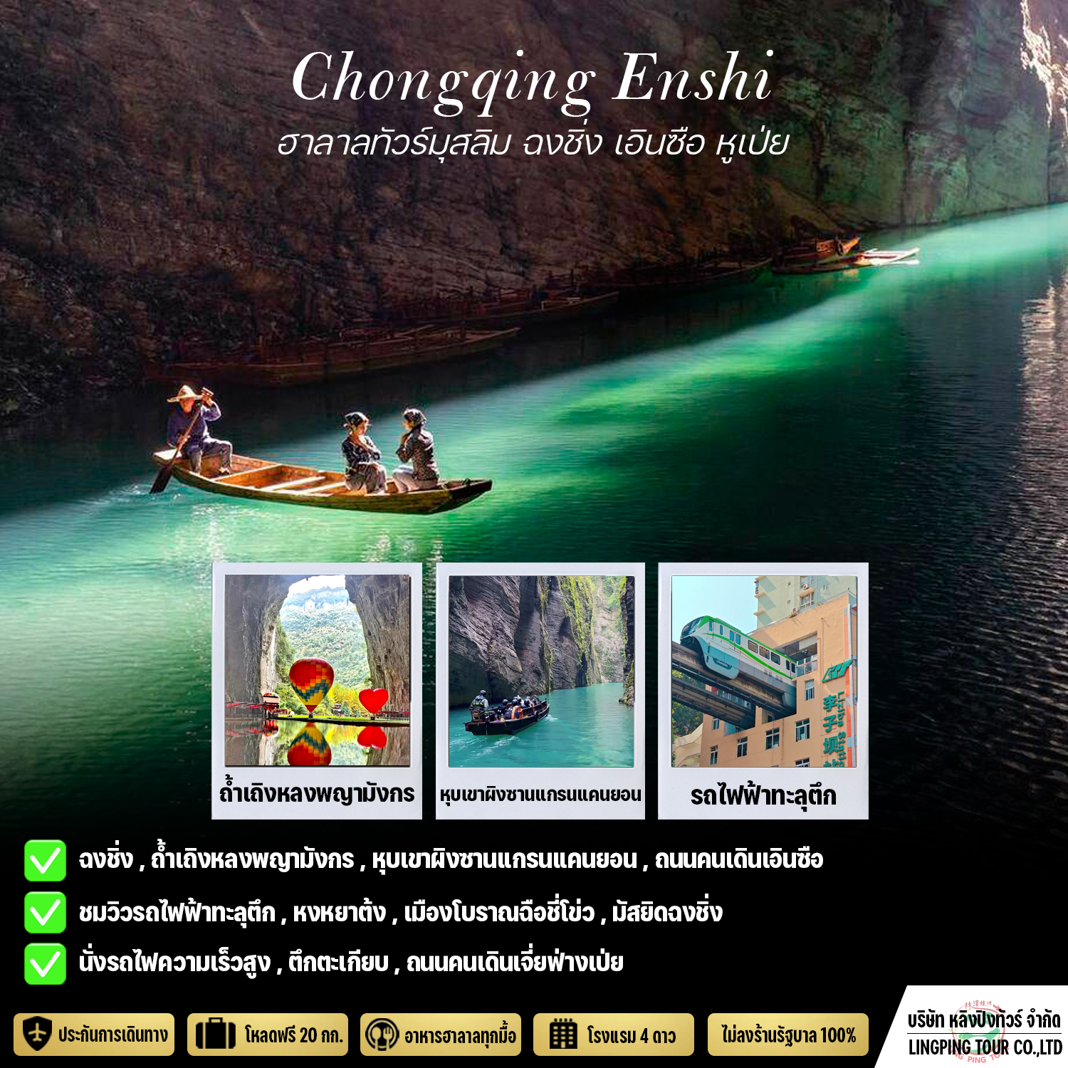 ทัวร์ฮาลาลเส้นทาง ฉงชิ่ง–เอินซือ–หูเป่ย–หุบเขาผิงซานแกรนด์แคนยอน 5 วัน 4 คืน เป็นโปรแกรมท่องเที่ยวที่เน้นสัมผัสธรรมชาติภูมิประเทศหินปูนอันยิ่งใหญ่ของจีนตอนกลาง โดยไฮไลต์อยู่ที่การเที่ยวชมเอินซือแกรนด์แคนยอน เดินชมหน้าผาและวิวภูเขา รวมถึงล่องเรือในหุบเขาผิงซานที่มีน้ำใสและทัศนียภาพสวยงาม ควบคู่กับการสัมผัสวัฒนธรรมท้องถิ่นระหว่างเส้นทาง ทริปนี้จัดในรูปแบบฮาลาลเพื่อความสะดวกของผู้เดินทางมุสลิมทั้งด้านอาหารและการบริการ จึงเหมาะสำหรับผู้ที่ต้องการเที่ยวธรรมชาติระดับไฮไลต์ของจีนภายในเวลาสั้น ๆ อย่างครบถ้วนครับ